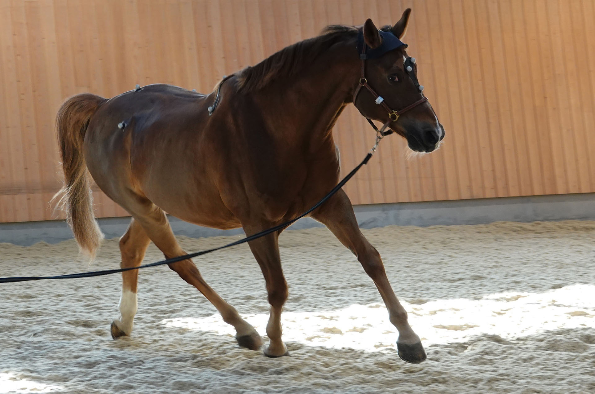 Figur 1. Hesten er utstyrt med reflektive markører som en del av en halthetsutredning. Infrarøde Optical Motion Capture (mocap) kameraer (Qualisys®) registrerer bevegelse av markørene fra flere ulike vinkler samtidig og gir svært nøyaktige data.