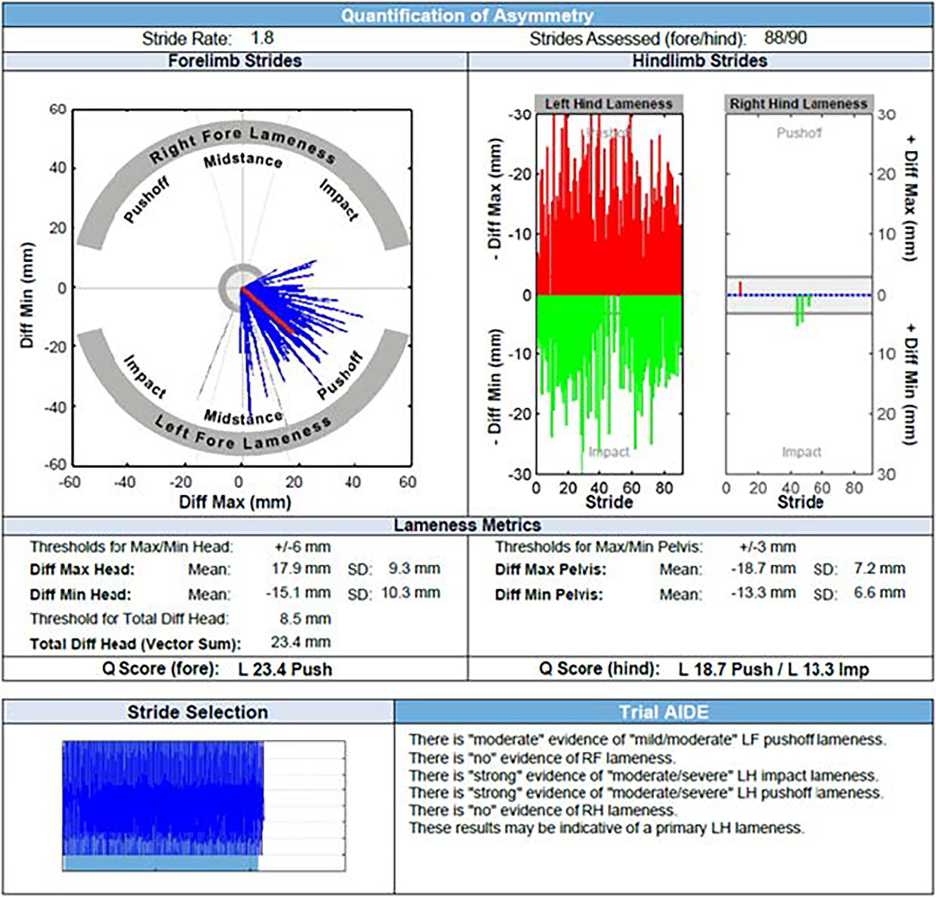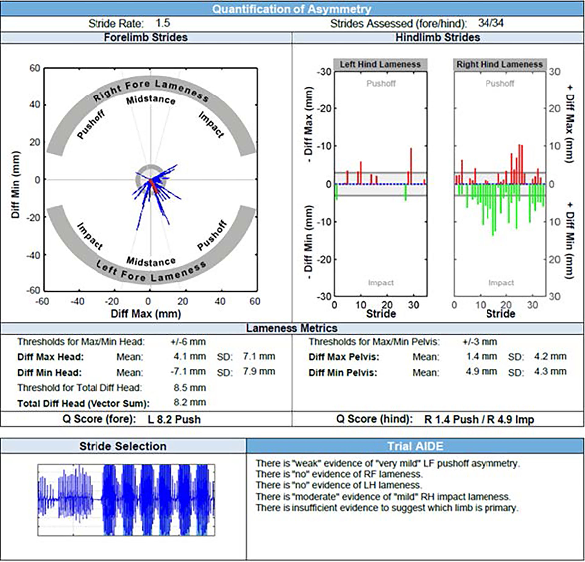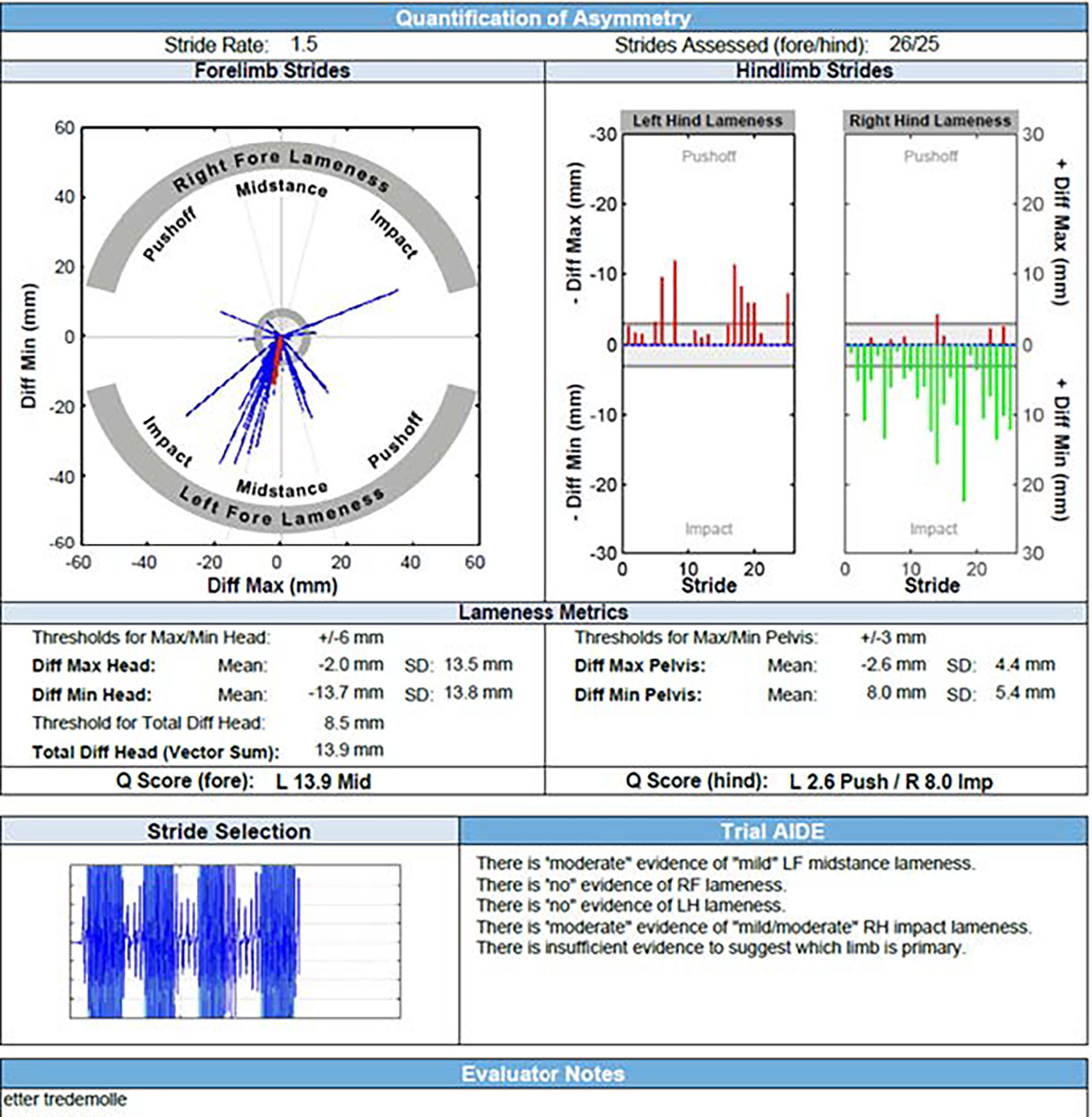 Figur 3. Datafremstilling fra Equinosis Q® Lameness Locator, fra en treårig varmblodstraver-hingst registrert under mønstring for hånd i trav på asfalt. Fremstillingen viser en lavgradig halthet på høyre bakbein (grønne linjer som peker nedover under rubrikken «Right Hind Lameness». Hesten viser også en lavgradig, ustabil halthet på venstre frambein (blå streker som peker hovedsakelig mot «Left Fore Lameness»).