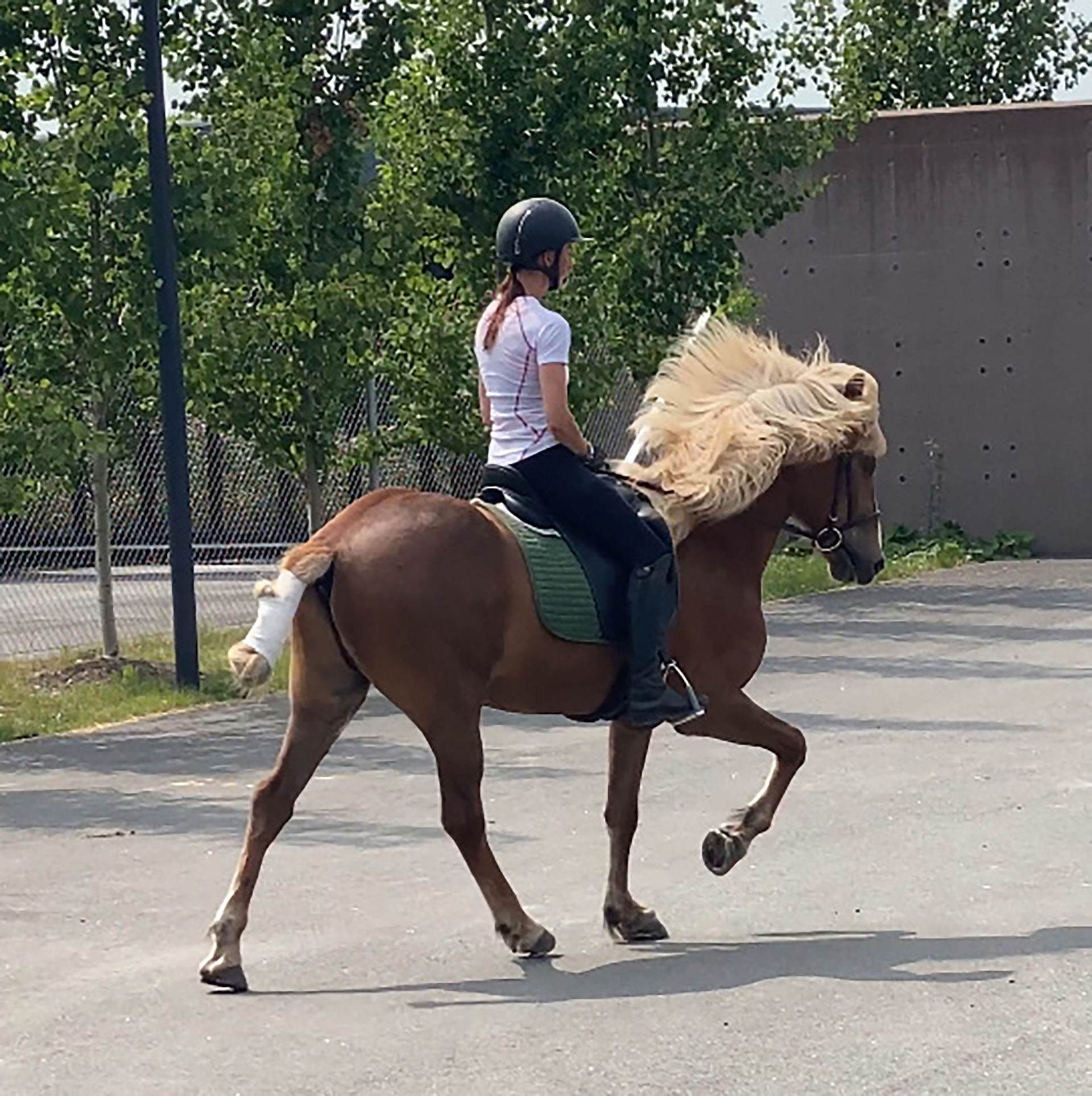 Figur 6. Halthetsutredning under rytter hos en Islandshest med en svært lavgradig bakbeinshalthet som kjentes av rytter ved ridning i tølt. Lokalbedøvelser ble evaluert mens hesten ble ridd i tølt på et hardt underlag.