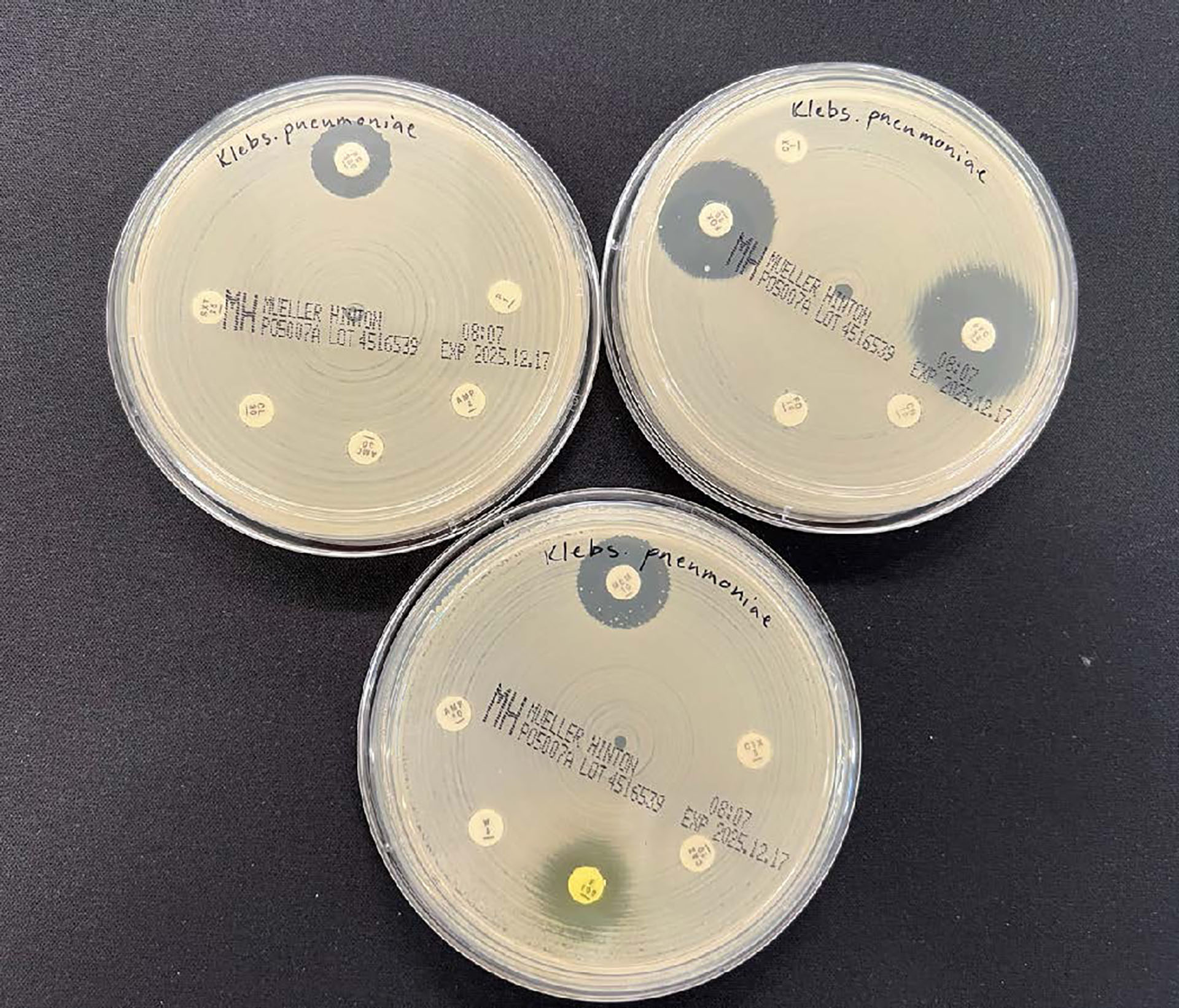 Multiresistent Klebsiella pneumoniae fra hund resistenstestet med agardiffusjon. Resistens viser seg ved manglende hemningssoner rundt lappene.