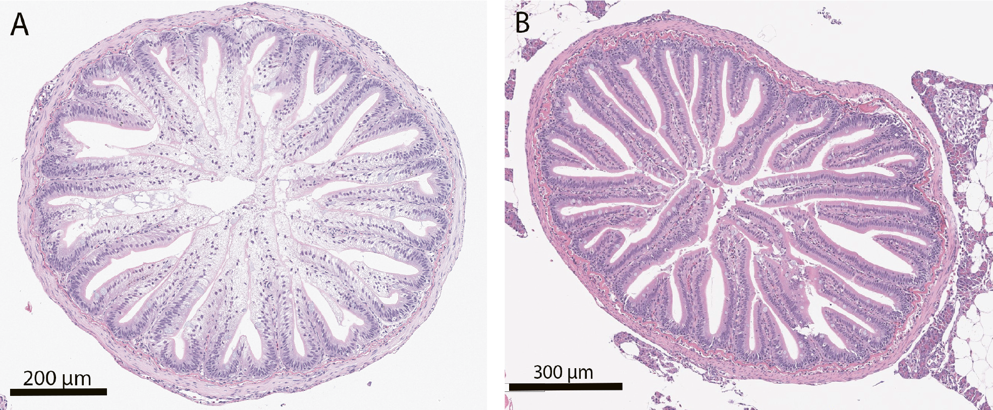 I løpet av sensommeren og høsten 2025 mottok Pharmaq Analytiq flere diagnostikksaker fra flere produsenter med histologiske funn forenelige med intestinal steatose hos settefisk. Fiskene varierte i størrelse fra cirka 5 til 40 gram, og kom både fra gjennomstrømningsanlegg og resirkuleringsanlegg (RAS). Histologiske undersøkelser viste økt forekomst av intracellulære lipidvakuoler i epitelet i pylorusblindsekkene, svulne epitelceller og kondenserte cellekjerner (figur 1). I enkelte tilfeller ble det også rapportert om hvitfargede blindsekker ved obduksjon (figur 2). I to saker var intestinal steatose det dominerende funnet, mens de fleste øvrige saker også viste histopatologiske forandringer i andre organer, som nefrokalsinose, hjertebetennelse, svømmeblærebetennelse og tegn på systemisk bakterieinfeksjon.