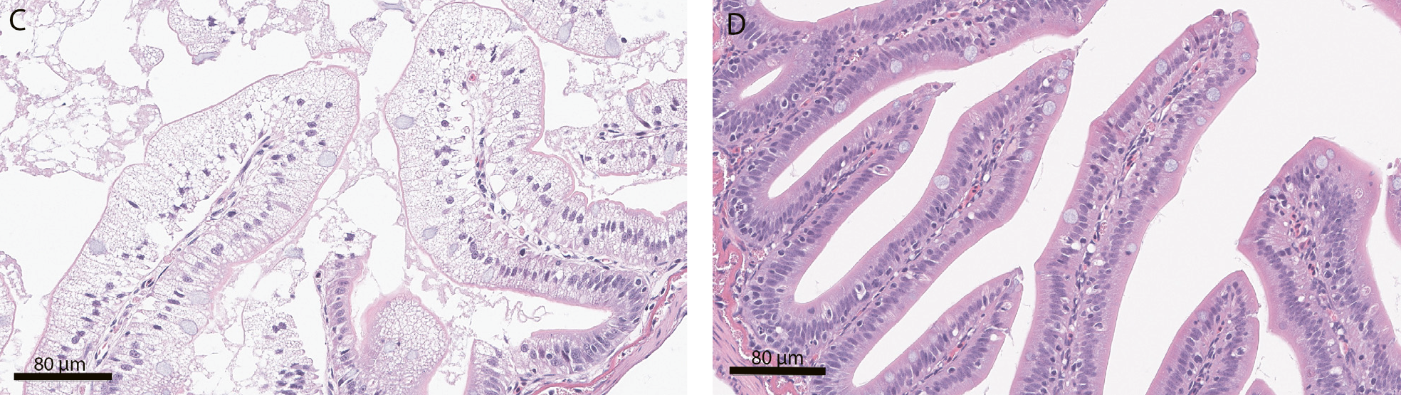 Figur 1. Histologiske snitt av pylorusblindsekker fra fisk med intestinal steatose (A og C) og fra fisk med normal tarm (B og D). Tarmfoldene fremstår lysere i (A) grunnet uttalt vakuolisering av epitelcellene. I figur C ser man også at cellekjernene er kondenserte sammenlignet med kjernene i normalt epitel i figur D. Hematoksylineosin (HE).