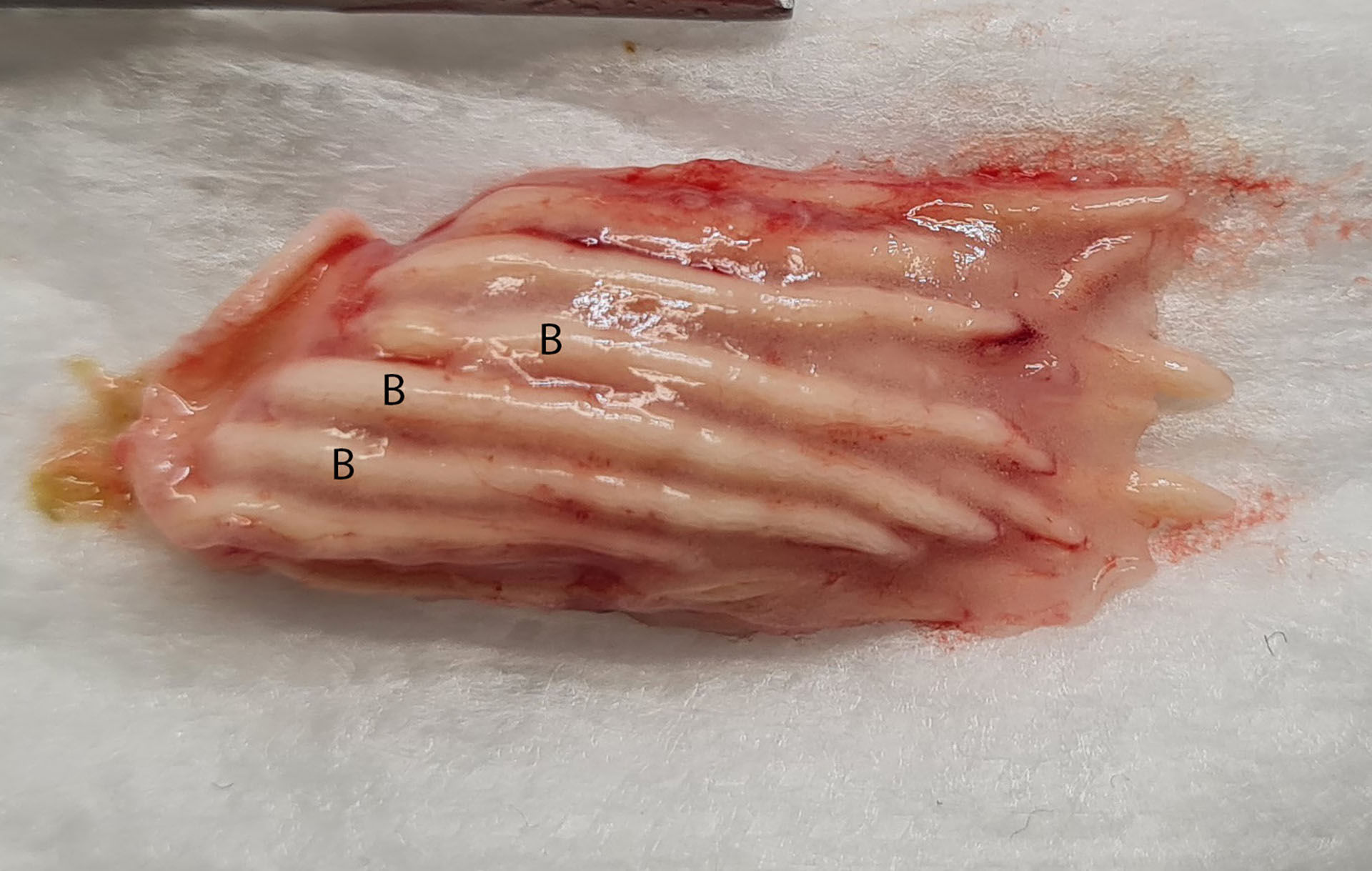 Figur 2. Pylorusblindsekker fra laks. Blindsekkene (B) er tilnærmet hvite.