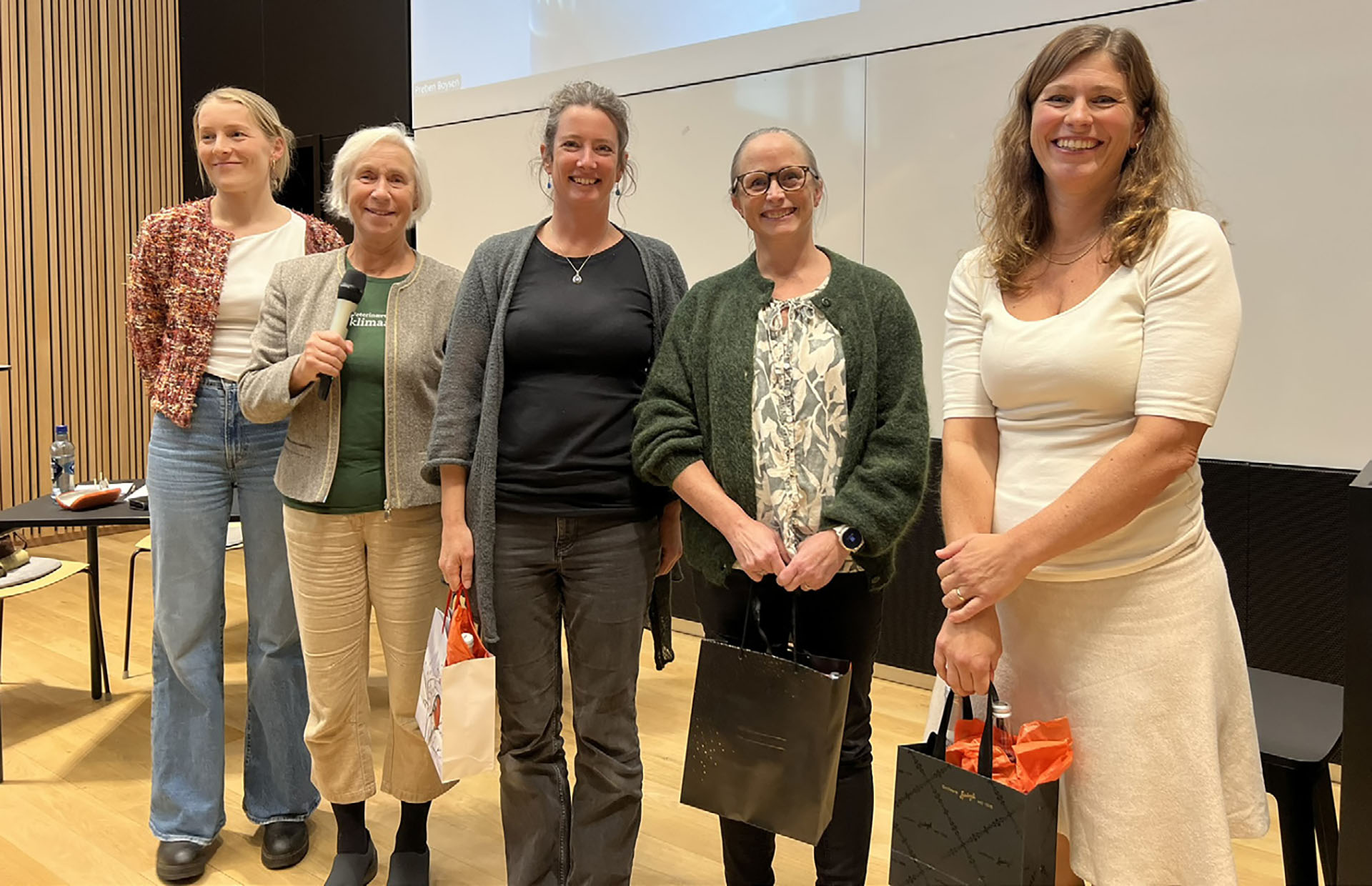 Møtelederne og innlederne i auditoriet, fra venstre til høyre: Mari Nyborg Hauback (NMBU Veterinærhøgskolen), Karen Johanne Baalsrud (Veterinært bærekraftforum), Martine Muusse (DMP), Monica Heggelund (Evidensia) og Marit Jørgensen Bakke (NMBU Veterinærhøgskolen).