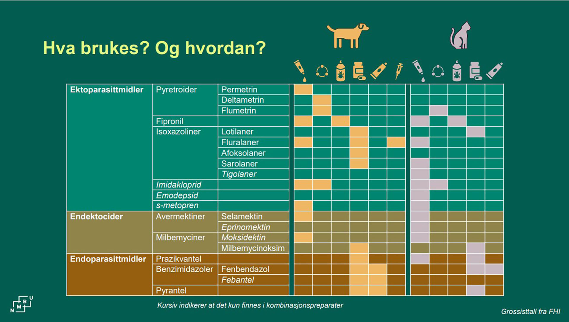 Hvilke virkestoffer brukes til hund og katt? En av oversiktsplansjene til Marit Jørgensen Bakke.