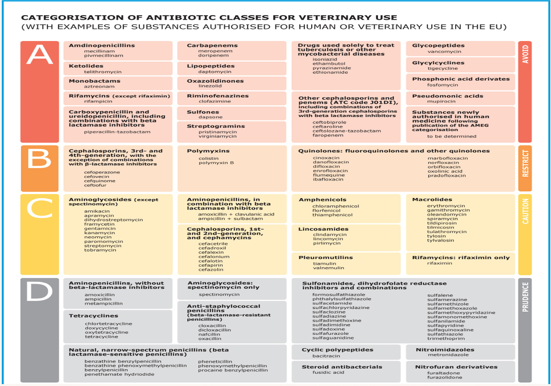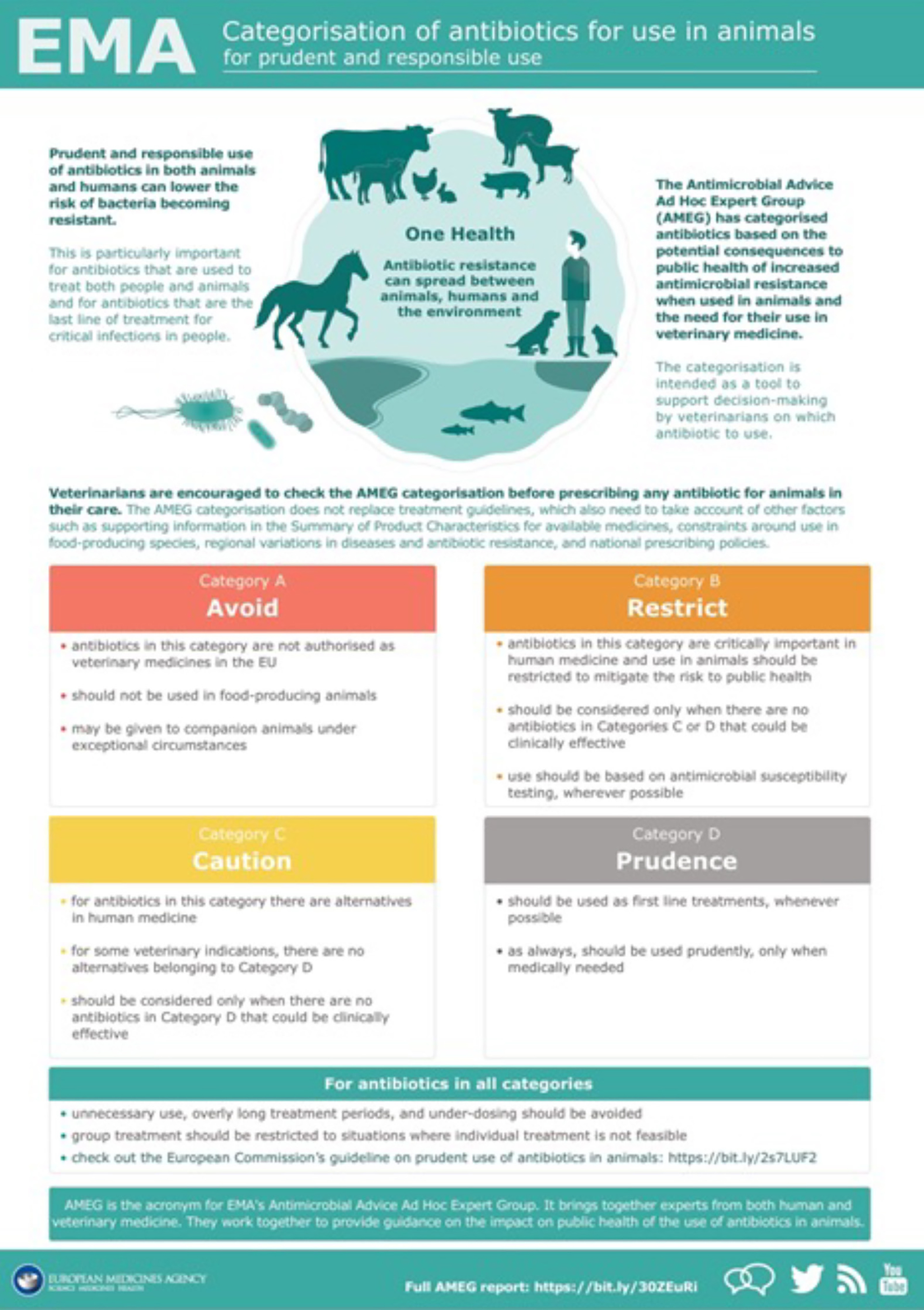 European Medicines Agency (EMA) har i samarbeid med Antimicrobial Advice Ad Hoc Expert Group (AMEG) kategorisert antibiotika for bruk i veterinærmedisin i fire grupper; A (Avoid), B (Restrict), C (Caution) og D (Prudence). Kategori A består av antibiotika som ikke skal brukes til matproduserende dyr og kun i helt spesielle tilfeller til selskapsdyr. Kategori B er også kritisk viktige antibiotika for humanmedisinen, som fluorokinoloner, 3. og 4. generasjons cefalosporiner og polymyxiner, og bør unngås brukt til dyr. Kategori C skal kun brukes i veterinærmedisin når ingen midler i kategori D er klinisk effektive. Kategori D er førstevalg ved behandling av dyr. Preparatene skal brukes med forsiktighet og kun når det er medisinsk nødvendig. Veterinærer med en høy andel av antibiotikaforbruk i kategori B gir grunn til bekymring om uforsvarlig legemiddelbruk.