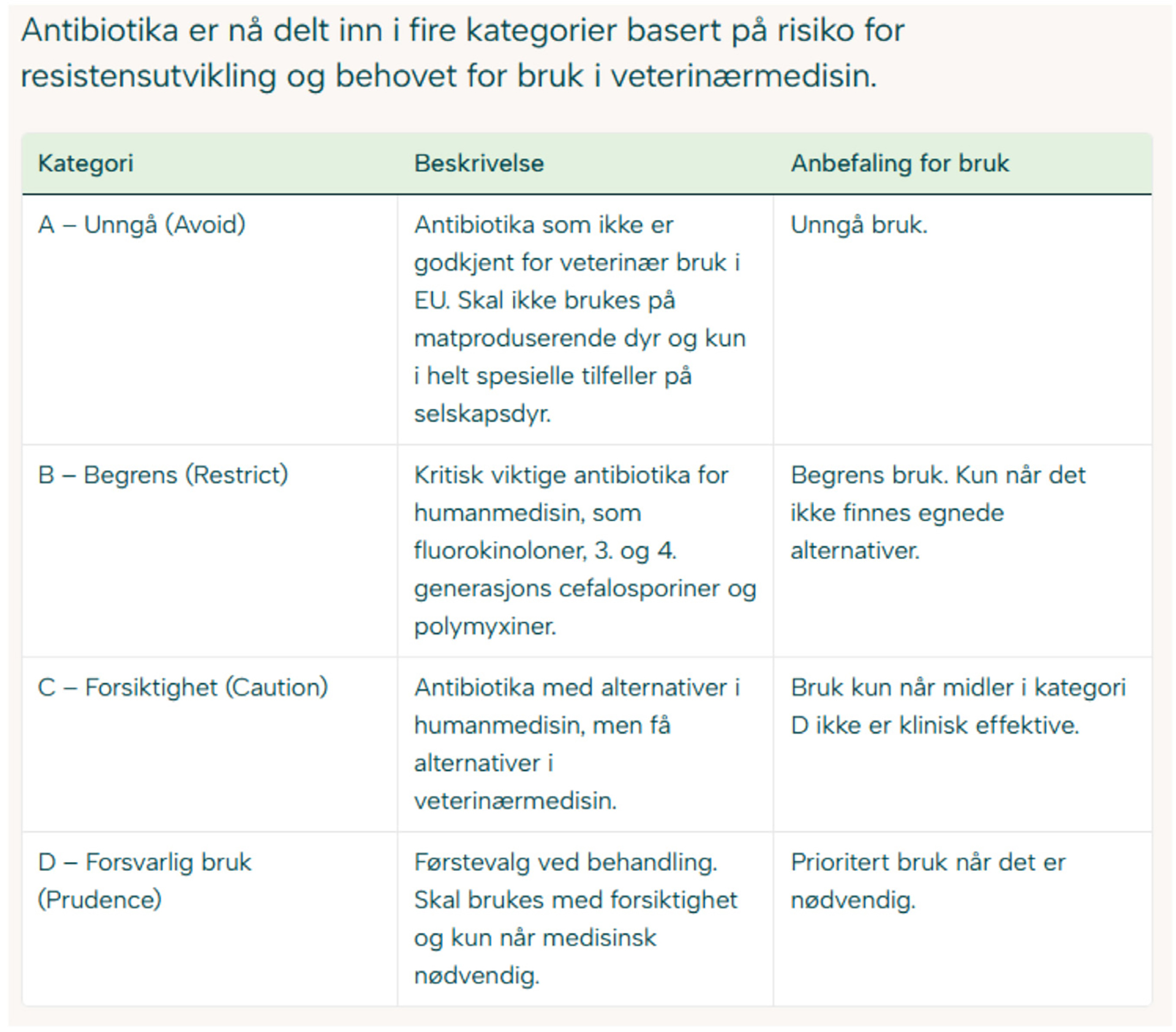 Kategorisering av antibiotikaklasser til veterinært bruk.